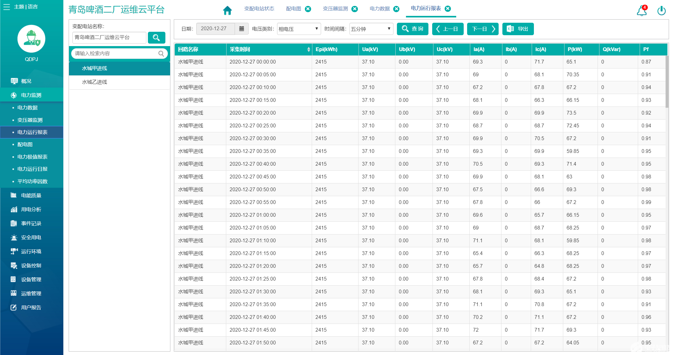 电力数据显示变电所各回路的电力数据和曲线,包括电流、相电压、线电压、频率、功率因数、有功功率、无功功率、视在功率等参数,并可导出图表。