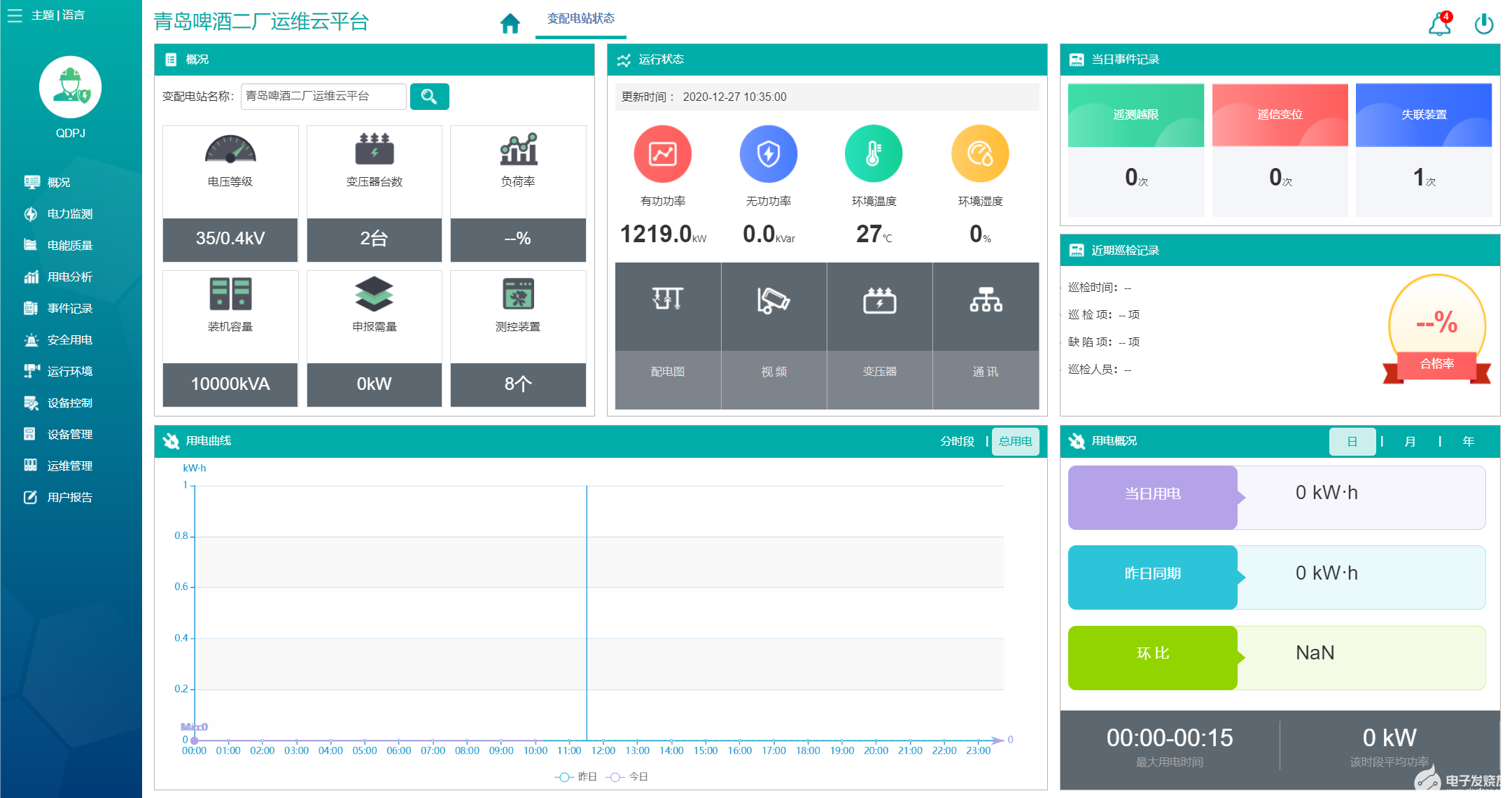 平台首页为变电所概况,包括变电所状态、地图导航和用能月报。变电所状态包括:变电所概况、运行状态、当日事件记录、当日逐时用电曲线、用电概况。