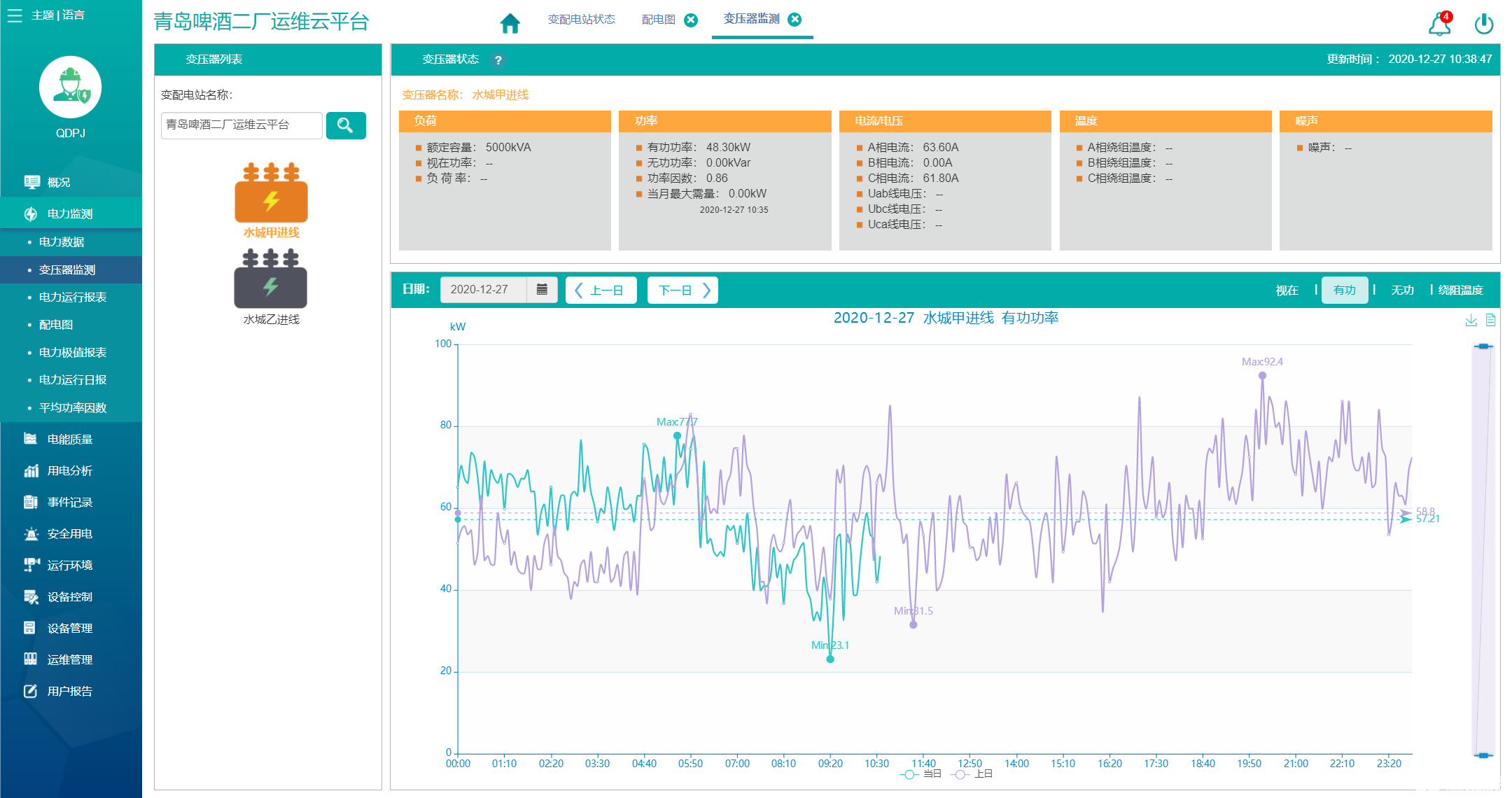 显示变压器的运行状况,变压器列表显示变压器的电压等级;变压器状态显示变压器的运行参数,即变压器的负荷、功率、电流、电压、温度以及功率曲线。