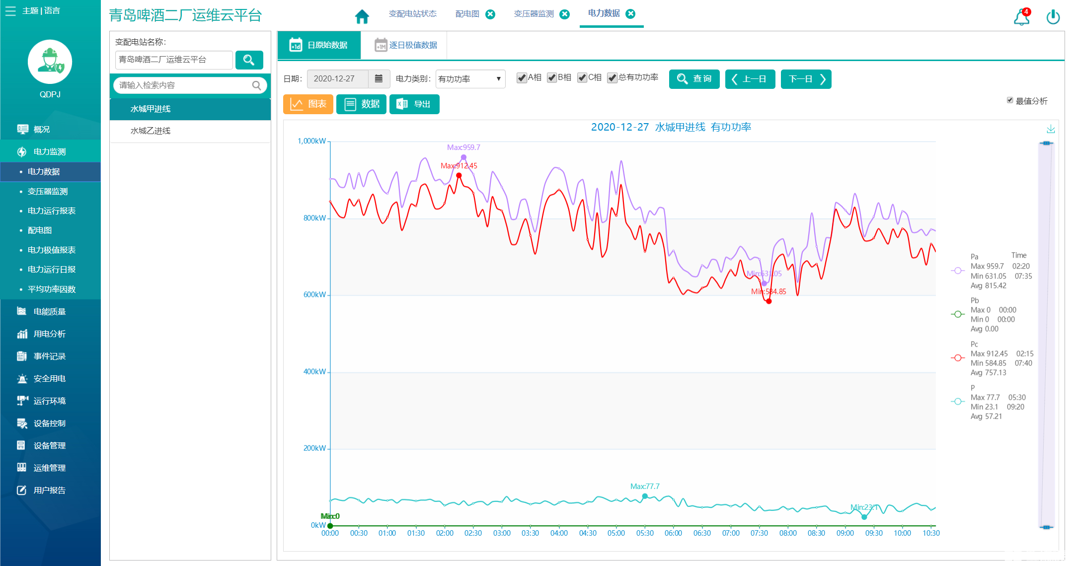 电力数据显示变电所各回路的电力数据和曲线,包括电流、相电压、线电压、频率、功率因数、有功功率、无功功率、视在功率等参数,并可导出图表。