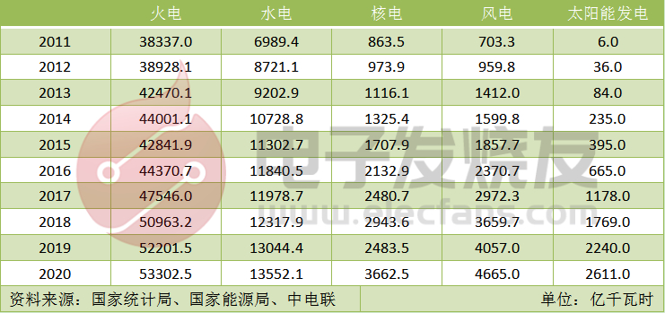 2011-2020年全国发电量结构
