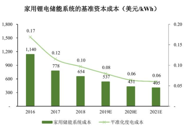 根据BNEF统计,截至2018年,一套完整安装的14kWh家用锂电储能系统的基准资本成本为654美元/kWh,折算为平准化度电成本约为0.1美元/kWh,较2016年下降约42.6%。BNEF预计到2021年该成本将下降至405美元/kWh,未来三年累计下降幅度为38.1%。