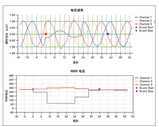 图2:电压波形和RMS值随时间的变化:配电系统中的瞬时短路,会导致电压瞬降。