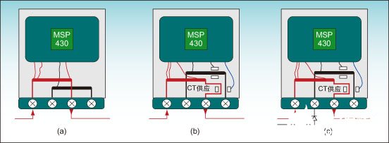MSP430FE42x内置有三个独立的16位ADC及电能计量模块ESP430。其中ESP430能够自动控制三个独立的16位ADC进行两个电流通道(火线、零线)和一个电压通道的采样,并自动比较两个电流通道的电流大小,实现电流不平衡时的检测和防窃电测量。图2c为同时测量两个电流通道的模型。