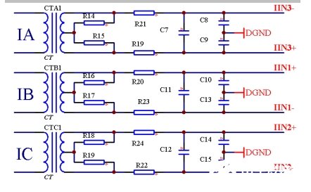 电流转化模块是通过电流互感器,把0-6安的三相电流信号转化成三个400mV的信号,经过阻容滤波送入CS5451A(见图3)。