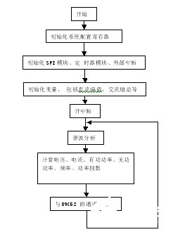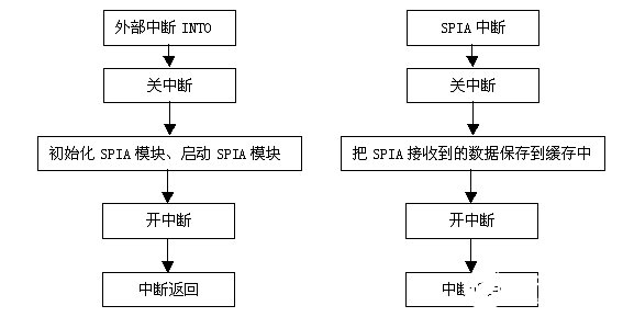 外部中断用来捕捉CS5451A的同步信号,在捕捉到同步信号以后,初始化并启动SPIA模块,SPIA模块在接收到12个字节数据以后产生中断,把数据保存到缓存中。流程如图5。