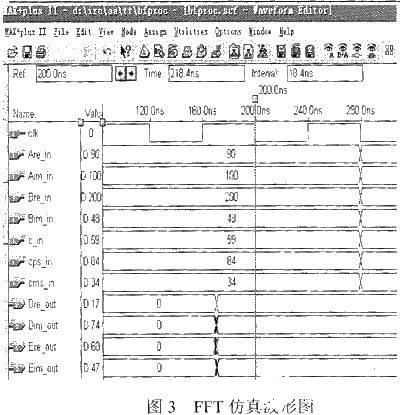 假设CLK为输入一个周期为80ns的时钟,Are_in,Aim_in为输入数据的实部和虚部,旋转因子采用乘以128归一化的8bit有符弓数。旋转因子欧拉公式变换为近似值C+jS=59+j25,则cps=c+s=84,cms=c-s=34,计算出的第一个数的实部、席部为Dre_out、Dim_out,第一个数的实部、虚部为Ere_out、Eim_out,由maxplus2生成的波形文件的图形如图3所示。