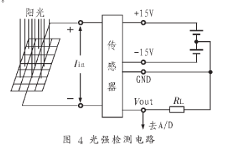 太阳光强和太阳能电池组件表面光强的检测非常重要,是系统太阳能电池组件性能和聚光发电效率的一个重要参数。在太阳光的照射下,由于太阳电池的输出短路电流与太阳辐照度成正比,故选取一块经标准光强标定好的光电池作为光强传感器,只要测出其输出短路电流和表面温度即可推算出当时其表面所受的辐射光强。检测电路原理如图4所示。