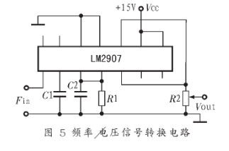 风速检测是采用长春气象仪研究所生产的FC-1型风速风向传感器。风杯风速仪是用风杯旋转架作为感应元件,一个多齿转盘和光电断器用来将转子速度转换为与风速成正比的频率电信号,为了获得A/D采集卡采集的电压信号,还必须外加电压取样电路。将电频率信号转变成电压信号。把频率信号送入频率/电压转换器中,经过取样电路,就可以得到与风速成正比的标准电压信号。其检测电路原理如图5所示。