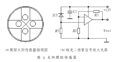 太阳位置的变化会引起照射在平面镜镜面光强的变化,要使平面镜接收到最大的光强,应使镜面与太阳光线照射垂直,因此必须使平面镜跟踪太阳。太阳位置由高度角和方位角确定,可利用两个步进电机驱动平面镜作两轴运动,达到跟踪太阳的目的。在高度角和方位角跟踪时分别利用两只2CU型光电二极管作为太阳位置的敏感元件。4只光电二极管安装在同一个半球形的传感器壳内。每对二极管被中间隔板隔开,对称地放在隔板两侧。传感器俯视结构如图6(a)所示。当镜面对准太阳时,太阳光平行于隔板,两只二极管的感光量相等,输出电压相同。当太阳光略有偏移时,隔板的阴影落在其中一只二极管上,使两只二极管的感光量不等,输出电压也不相等。根据输出电压确定步进电机的转向,控制相关的继电器动作,接通步进电机使其转动。当转到太阳光重新平行于隔板时,两只二极管输出相同电压,继电器断开,电机停转。光电二极管信号放大电路如图6(b)所示。