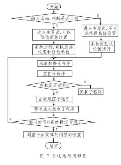系统运行流程图如图7所示。本软件设计采用Windows操作系统作为工作平台,以采集卡和I/O卡的驱动程序作为编程语言,主要包括主程序、采集数据子程序、监控子程序、跟踪子 程序、蓄电池充放电子程序等。此系统中数据采集量巨大,数据的处理要求高,随着时间的推移,数据的统计、保存、查询都会变的更加复杂。因此,必须采用先进的数据库管理技术。系统采用Visual Basic6.0软件平台。