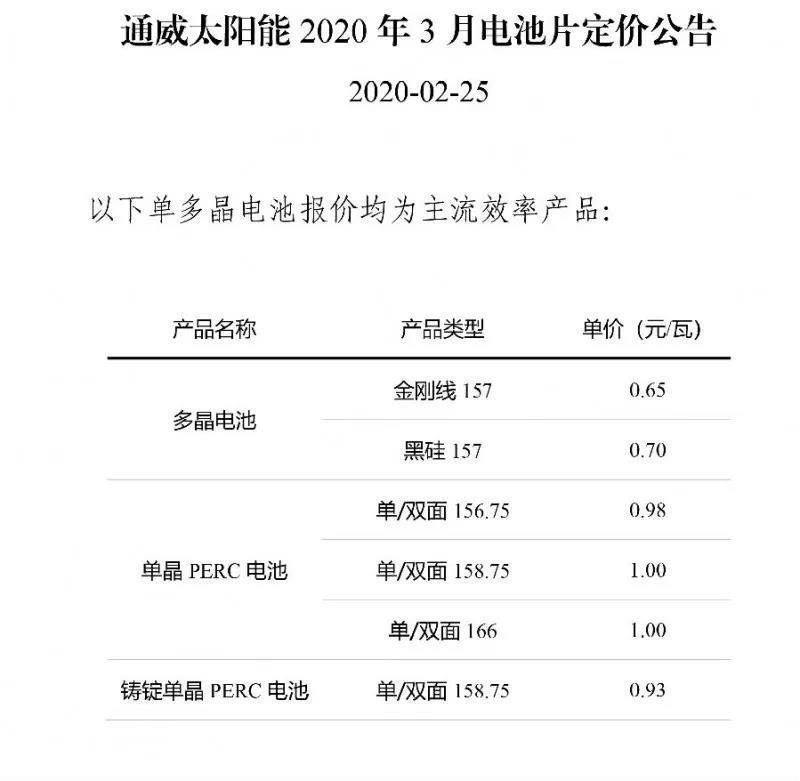 3月26日,通威公布电池片4月份定价。通威4月份电池片全线降价:公告显示,每瓦价格全线下调3-7分钱,其中156.75单晶PERC电池降幅最大,从3月0.98元/W降至0.91元/W。