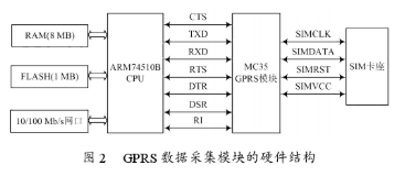 电能流量测量设备有两种工作方式:一是按事先设定好的时间间隔,周期性地采集用户数据,实时地传送到数据库服务器;二是实时地响应来自于通信服务器的控制命令,按照控制命令进行特定的数据采集任务。这就要求作为数据传输模块和终端设备控制模块的GPRS终端能够实时地解析、处理各种控制命令并向数据传输服务提供尽可能大的吞吐率。另外考虑到系统的可扩展性,本系统硬件设计时没有采用传统的低成本但是高开发费用且性能、功能受限制的单片机加GPRS通讯模块的方案,而是使用了以高性能嵌入式CPU芯片为核心的设计方案。GPRS数据传输终端的硬件组成和连接如图2所示。CPU采用了专为网络解决方案设计的SamsungARM74510B。GPRS模块采用目前比较流行的西门子MC35系列模块。
