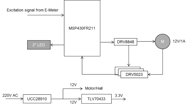 MCU发出的合闸和分闸指令需要由直流电机来执行,并最终带动执行机构完成动作。这个系统里采用DRV8848方案,其一组控制输出直接驱动直流电机执行指令,另一组输出用来控制位置霍尔传感器DRV5023的供电电源通断,以降低合闸后的系统功耗,从而达到0.2mA输入电流的要求。