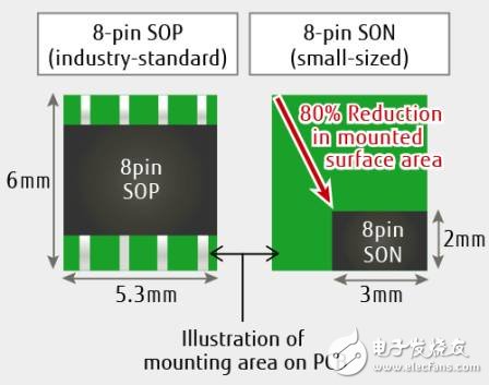 除了业界标准8引脚SOP之外,该产品还提供小型8引脚SON版本,其安装面积约为SOP的20%(图3);安装体积则为SOP的8%,适用于需要小型化的应用。