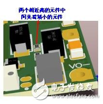 (3)放置器件时要考虑以后的焊接和维修,两个高度高的元件之间尽量避免放置矮小的元件,如图2所示,这样不利于生产和维护,元件之间最好也不要太密集,但是随着电子技术的发展,现在的开关电源越来越趋于小型化和紧凑化,所以就需要平衡好两者之间的度了,既要方便焊装与维护又要兼顾紧凑。还有就是要考虑实际的贴片加工能力,按照IPC-A-610E的标准,考虑元件侧面偏移的精度,不然容易造成元件之间连锡,甚至由于元件偏移造成元件距离不够。