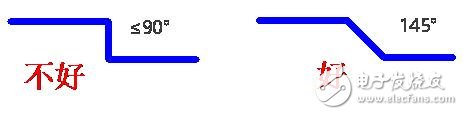 (3)相邻之间不应有过长的平行线(当然同一电流回路平行走线是可以的),上下层走线尽量采用交叉用垂直方式,走线不要突然拐角(即:≤90°),直角、锐角在高频电路中会影响电气性能。