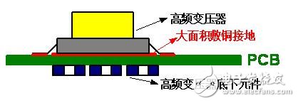 (5)高频元件(如变压器、电感)底下第一层不要走线,高频元件正对着的底面也最好不要放置元件,如果无法避免,可以采用屏蔽的方式,例如高频元件在Top层,控制电路正对着在Bottom层,注意要在高频元件所在的第一层敷铜进行屏蔽,如图11所示,这样可以避免高频噪声辐射干扰到底面的控制电路。