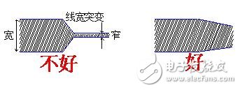 (7)电源线、地线尽量靠近,以减小所包围的面积,从而减小外界磁场环路切割产生的电磁干扰,同时减少环路对外的电磁辐射。电源线、地线的布线尽量加粗缩短,以减小环路电阻,转角要圆滑,线宽不要突变,如图13所示。