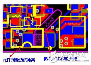 (2)元件到板边的距离要求。位于电路板边缘的元器件,离电路板边缘一般不少于2mm,对于像10W以下的小型化DC-DC模块,由于元件体积和高度比较小,而且输入输出电压不高,为了满足小型化的要求,也要至少留有0.5mm以上的距离。大面积铜箔到外框的距离应至少保证0.20mm以上的间距,因在铣外形时容易铣到铜箔上造成铜箔翘起及由其引起焊剂脱落问题。
