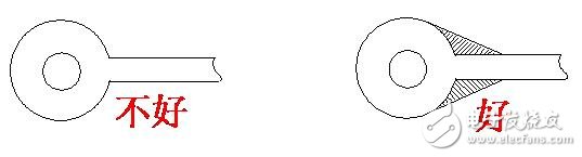 (3)若走线入圆焊盘或过孔的宽度较圆焊盘的直径小时,则需加泪滴,加强吸附力,避免焊盘或过孔脱落。