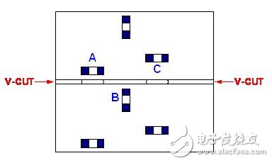(5)PCB拼板的时候,要考虑分板可行性,确保元件离板边的距离要足够,同时还要考虑分板的应力会不会造成元件的脱翘。如图17所示,可以适当的开槽,减小分断PCB时的应力,元件A摆放的位置与V-CUT槽方向平行,分断时应力比元件B小;元件C比元件A远离V-CUT槽,分断时应力也比元件A的小。