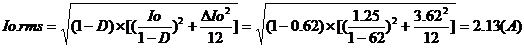 假设已知连续工作模式的反激变换器,其输出电流Io为1.25A,纹波率r为1.1,占空比D为0.62,开关频率为60kHz,由此可以计算次级纹波电流ΔIo和有效值电流Io.rms。