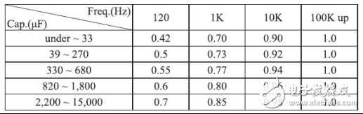 该纹波电流需在电源开关频率下选择,如下图某厂家电容手册的纹波电流有频率因子,不同频率下的纹波电流不同。高频低阻电容均会给出100kHz下的纹波电流,本设计开关频率为60kHz,频率因子为0.96~1之间,在此取1即可。