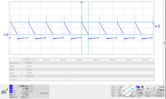 测试电解电容纹波电流时,需将电容引脚穿入电流探头中,通过示波器可读得交流有效值。本设计实例的纹波电流测试结果如图3所示,示波器读得有效纹波电流为1.64A,与理论设计接近。因此理论计算具有较大的工程指导意义。