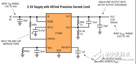 LT3066 采用小型、低成本、最低 3.3µF 的陶瓷输出电容器工作。该器件的 PWRGD 标记指示输出处于稳定状态。LT3066 用一个电阻器精确设定外部电流限制 (在整个温度范围内为 ±10%)。此外,LT3066 的内部保护电路包括电池反向保护、电流反向保护、折返电流限制和过热限制。主动放电电路提供安全工作区 (SOA) 折返功能,以保护下拉 NMOS,使 OUT 电压高于 6V,并提供范围很宽的 OUT 引脚绝对最大额定值:-1V 至 +20V。如图 1 所示,该器件具很宽的输入和输出电压范围、快速瞬态响应以及 64µA (工作时) 和 < 3µA (停机时) 的低静态电流,因此成为工业电源、航空电子系统电源、汽车电源、需要最佳运行时间的电池供电型系统及仪器、以及需要提供广泛保护的高可靠性电源之出色选择。