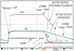 就高于 7V 左右的输出电压而言,LT3066 实施主动输出放电折返,因此,用来主动输出放电的晶体管之驱动降低了,这可限制该器件消耗的功率。由于产生了折返,所以在示波器显示屏上看到,LT3066 的 12V 波形从 12V 到 7V 的放电速度不那么快。在输出电压很高和使用大型电容器时,或者万一发生故障,使输出短路至很高的电压时,这样的放电速度可以保护 LT3066 免于损坏。