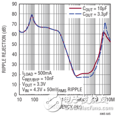 与 LT306x 系列中的其他器件相比,LT3066 通过 INFILT 引脚提高了 PSRR 性能。INFILT 引脚是一个单独的输入引脚,为误差放大器和基准供电。这个引脚通过内部 140? 电阻器连至 IN 引脚。在 INFILT 引脚和地之间连入一个去耦电容器,就形成了一个 RC 滤波器,以降低误差放大器和基准的输入电源纹波。在 INFILT 引脚上连接一个 0.47μF 去耦电容器,可在高于 10kHz 的频率上使 PSRR 改进多达 30dB。如果不需要输入滤波,那么就将 INFILT 引脚连至 IN 引脚。图 3 显示了与 LT3065 相比,LT3066 PSRR 性能的改进。