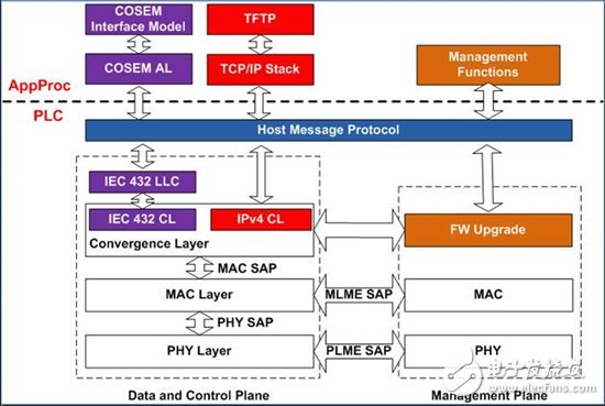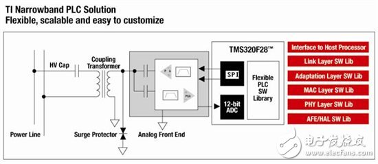 AFE031为模拟前端,集成了接收和发送两部分。C2000为32-bit MCU,PLC的AFE驱动层,物理层,MAC层,适配层,信号链路层和GUI接口层等均在C2000上以软件库的形式提供。