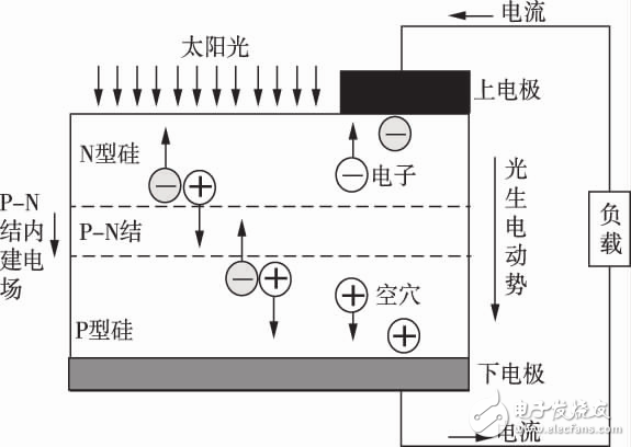1839 年, 法国的 Edmond Becquerel 发现了“光伏效应” , 即光照能使半导体材料内部的电荷分布状态发生变化而产生电动势和电流。光伏电池是基于半导体 P- N 结接受太阳光照产生光伏效应, 直接将光能转换成电能的能量转换器。1954 年,美国 Bell 实验室的 G. Pearson 等发明了单晶硅光伏电池, 其原理如图 1 所示。