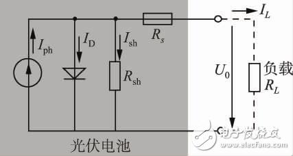图 1 中,太阳光照射到光伏电池表面, 其吸收具有一定能量的光子, 在内部产生处于非平衡状态的电子- 空穴对;在 P- N 结内建电场的作用下, 电子、 空穴分别被驱向N, P 区, 从而在 P- N 结附近形成与内建电场方向相反的光生电场;光生电场抵消 P- N 结内建电场后的多余部分使P, N 区分别带正、 负电, 于是产生由 N 区指向 P 区的光生电动势; 当外接负载后,则有电流从 P 区流出, 经负载从N 区流入光伏电池。图 2 为光伏电池等效电路, 其中, Iph为与光伏电池面积、 入射光辐照度成正比的光生电流(1 cm2硅光伏电池的 Iph值为 16 ~ 30 mA);ID, Ish分别为 P- N 结的正向电流、 漏电流;串联电阻 RS主要由电池体电阻、 电极导体电阻等组成(RS一般 <1 Ω);旁漏电阻 Rsh由硅片边缘不清洁或体内缺陷所致(Rsh一般为几 kΩ);RL 为外接负载电阻, IL, UO分别为光伏电池输出电压、 电流;当负载开路(RL= ∞)时,UO即为开路电压 Uoc, 其与环境温度成反比、 与电池面积无关(在 100 mW/cm2的光谱辐照度下, 硅光伏电池的 Uoc一般为 450 ~600 mV。与图 2 对应的光伏电池解析模型,