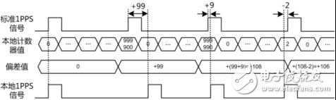 DT6000系列在对时的同时会进行校时,校正本地晶振的误差值。图 1.6为校时调整的一个实例说明图,由图中可以看出第一次粗略调节值为+99,第二次精确调节为正向,此时的Value=+99+9=+108,第三次精确调节为反向,此时的Value=+108-2=+106,在获取Value值的同时计数器也在一直均匀的调节。