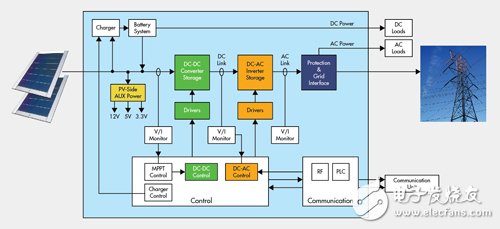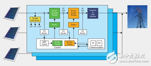 当太阳能逆变器作为支援数个PV板的独立单元时,称为中央逆变器(Central Inverter)(图2),其块状图式本质上与微型逆变器相同,只是多一个电池系统,可存储多个太阳能板的能量,然后输送到公用电网。中央逆变器的工作电压,一般均在1千瓦(kW)或者以上。