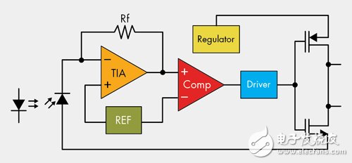 图3为光耦合器的内部方块图。驱动器每一部分,皆由一个普通电源或偏压电源供电。启动过程中,第一次打开电源时,电路的复杂性会造成延迟,这会造成闸极输出随着VDD电源而不断提高;它会不断上升,直到电源稳定。然后,一旦偏置电压正确,闸极驱动器输出就返回由发光二极体(LED)控制的正确状态。