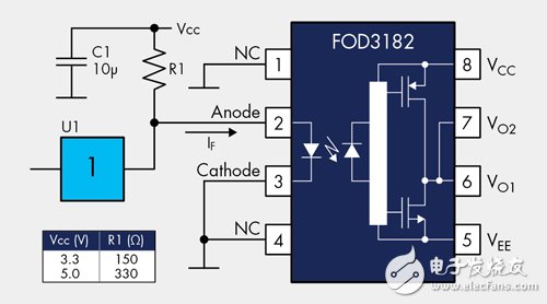 可做为控制功率MOSFET或IGBT闸极的功率缓衝器(Power Buffer)的光耦合器,以正电压(VOH)形式,为功率半导体的闸极提供峰值充电电流,从而开启设备。光耦合器将驱动设备的闸极拉至零电压(VOL)或更低,以便关闭闸极。