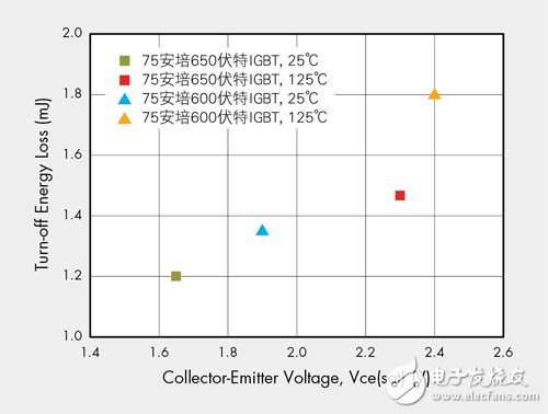 图1显示新型75安培(A)、650伏特场截止沟槽式IGBT,以及75安培、600伏特旧型场截止平面式IGBT两者的Vce(sat)与切换损耗特性比较,前者在25℃、75安培时,可达成1.65伏特Vce(sat),在相同条件下,后者则为1.9伏特。