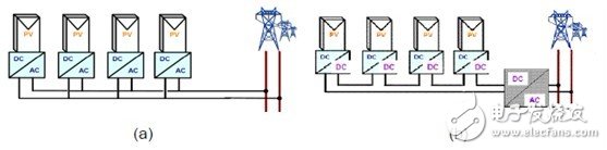 随着照度的变化,PV板的输出电压范围为20到45伏,因此如果入网应用需要更高的输出电压,则通常会考虑并串联PV板以获得高输入电压,并使用一个逆变器来实现电能转换。这种拓扑结构被称作“中央逆变器”,如图5(a)所示;它的主要特点是: