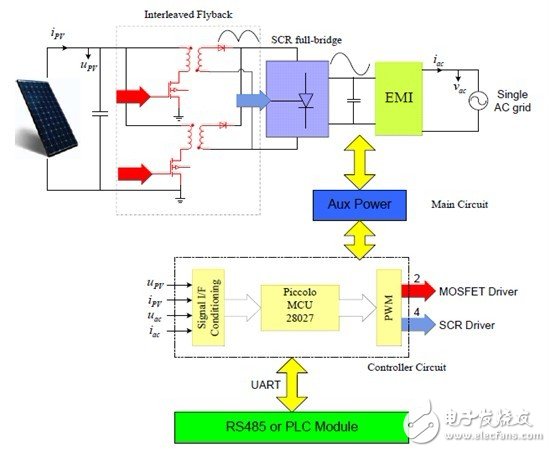 在我们的太阳能逆变器解决方案中,我们选择交叉反激加SCR全桥的拓扑,用于工业频率逆变。所有控制仅为一个MCU(2802x),另外还有一个RS485或者PLC接口,用于通信。图8显示了这种微型太阳能逆变器的结构图。具体规范,请参见《附件A》。