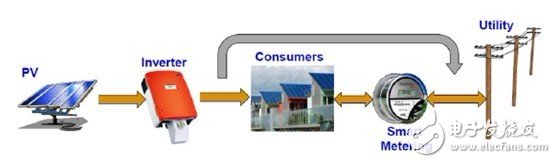 入网太阳能逆变器系统主要用于同传统电网连接,太阳能逆变器把来自PV板的电能连接传统电网,其主要组成为太阳能板、太阳能逆变器、智能双向电量计、家庭用电负载和传统电网等(参见图3)
