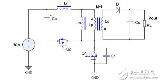 开关Q1和Q2与其相关体二极管一起出现。Cr表示两个开关的寄生电容的并联电容。与Lr谐振的这种器件电容,实现了Q1的零电压开关(ZVS)。