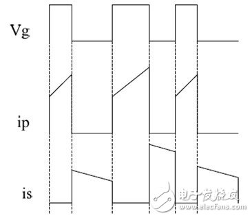 图8表明,闭环的反馈必须为一次侧电流ip,但在现实系统中,当Q1开启时其为中间点电流。如果转换器工作在连续模式下,则主反馈和次平均电流之间的关系为: