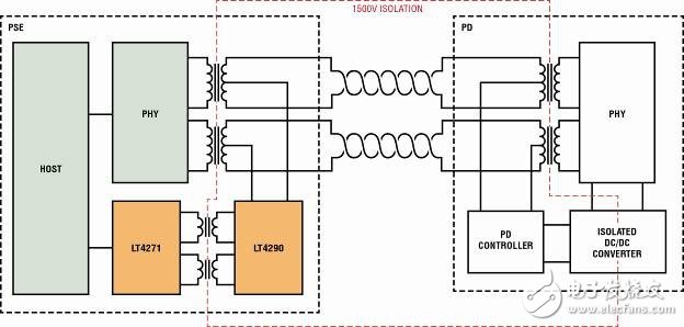 图1: LTC4290 / LTC4271芯片组实现了隔离功能,不需要任何光隔离器以及专用隔离DC/DC 转换器