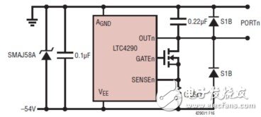 考虑 PoE 设计的可靠性非常重要,特别是处理大量的电缆、高电压、大电流或者高温的情况。凌力尔特公司在这方面经验丰富,设计了低成本、大吞吐量的电路保护方案,能够灵活的调整满足 IEC61000电缆放电电压要求。只需要一个 TVS 来保护高电压模拟电源,而在每一个输出端口上采用一对低成本箝位二极管 (图 2)。端口上的二极管引导有害的浪涌进入电源轨中,它们被浪涌抑制器以及VEE旁路电容吸收掉。浪涌抑制器还有保护 PSE 控制器不受 VEE 供电瞬变影响的优点。凌力尔特的 PSE 控制器在所有模拟引脚上还有 80V 绝对最大额定限制,实现了对瞬变的保护。