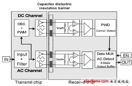 基本AC信道使用输入信号,并在过滤后透过由隔离电容组成的差分对传输该信号。然后,接收芯片上的施密特触发器的输入端对其进行检测,最后经输出缓冲器输出该接收到的信号。它可实现非常高速的传输、轻微脉宽失真和短传输延迟,但不能发送DC信号。