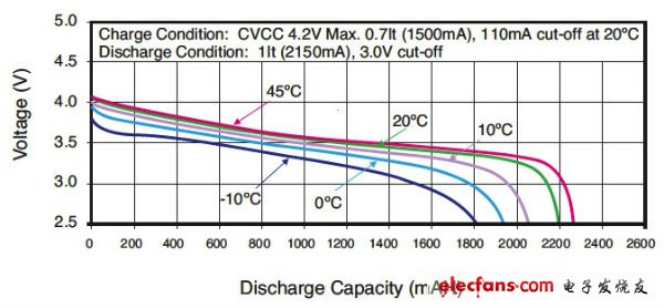 图2:在给定温度和放电电流值条件下,像松下CGR18650CG这样的锂离子电池在放电范围的中间部分具有接近平坦的输出电压。这对能源来说是一种优势,但对需要精确测量荷电状态(SOC)的工程师来说增加了设计复杂性。(松下公司提供)