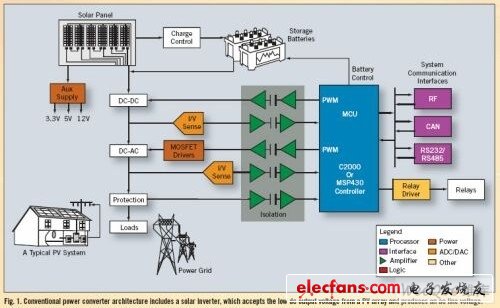 电源逆变器是太阳能发电系统的关键电子组件。在商业应用中,这些组件连接光伏(PV)面板、储存电能的电池以及本地电力分配系统或公用事业电网。图1显示的是一个典型的太阳能逆变器,它把来自光伏阵列输出的极低的直流电压转换成电池直流电压、交流线路电压和配电网电压等若干种电压。